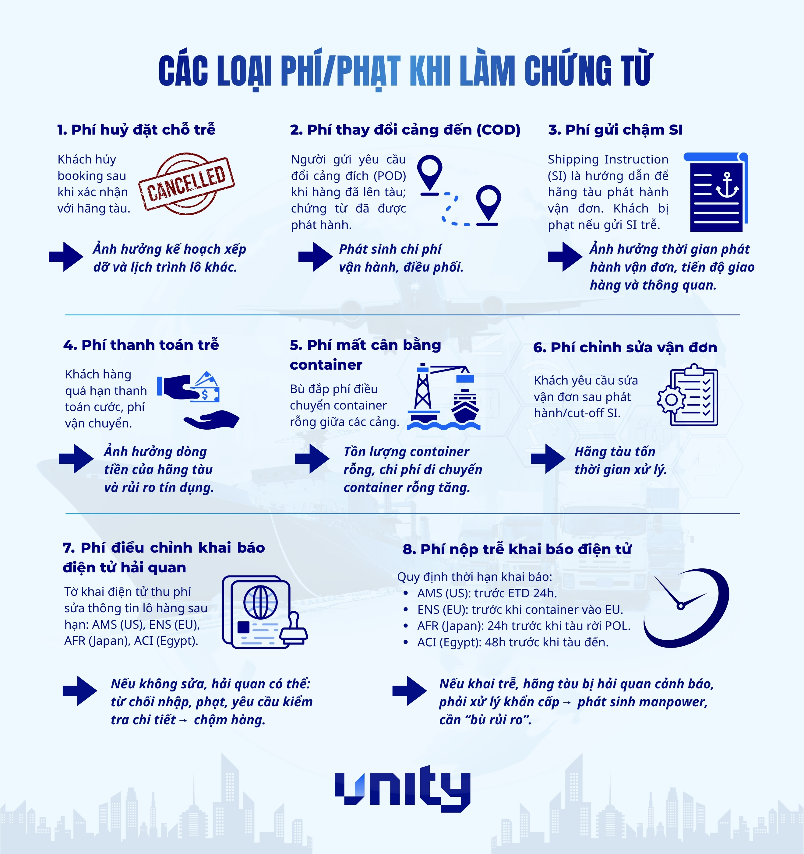 Trong xuất nhập khẩu, nhiều doanh nghiệp phát sinh chi phí ngoài dự kiến do không nắm rõ các loại phụ phí và phí phạt trong logistics. Những khoản phí như hủy booking trễ, sửa vận đơn hay nộp SI muộn có thể ảnh hưởng đến lợi nhuận nếu không kiểm soát tốt.