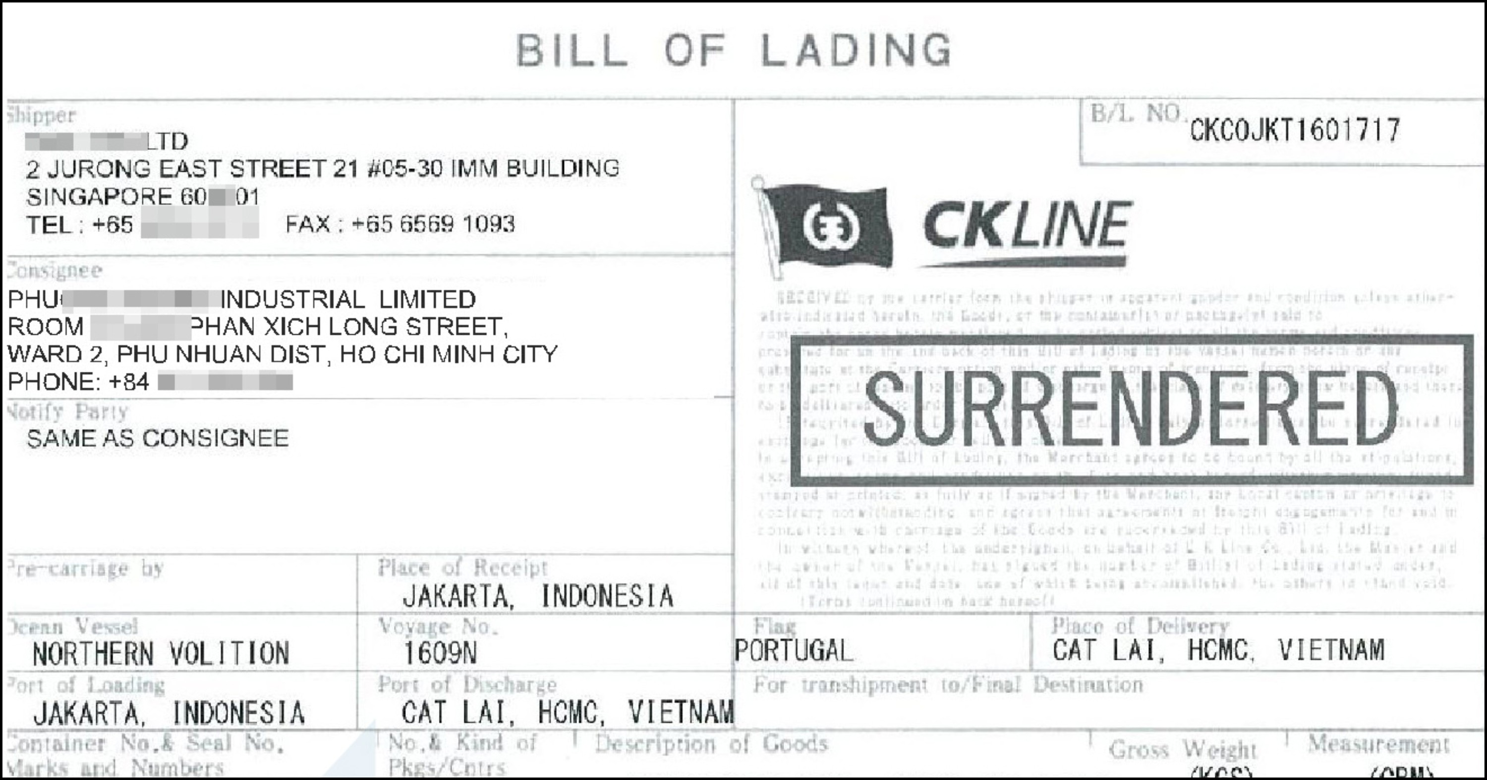 - Toàn bộ vận đơn gốc được nộp lại